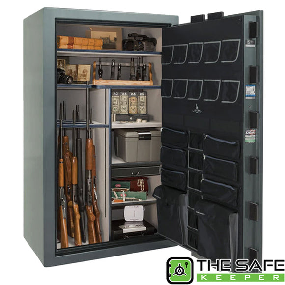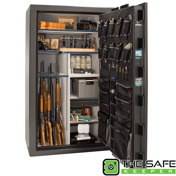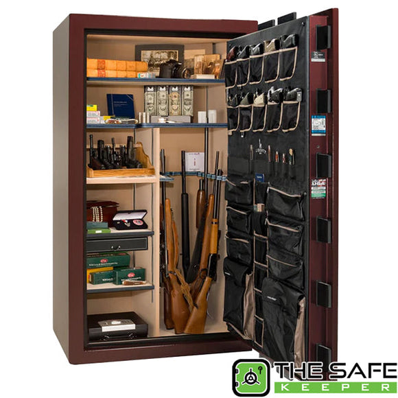 The Liberty National Magnum 50 Gun Safe is the ultimate home gun safe for storing up to 39 long guns and protecting valuables from fire, theft, and other hazards. This safe is the largest and most secure of its line, with a 2.5-hour fire rating, UL-listed security features, and a heavy-duty composite door. Online customization of this safe is possible with the colors, hardware, and lock type that suit the style and preferences of each customer. Four different interior shelving configurations are also available to organize the items as desired.