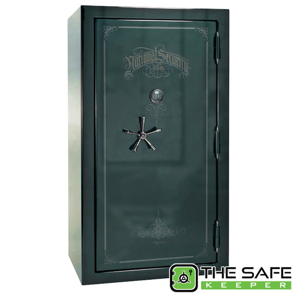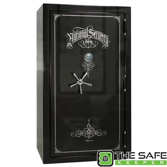The Liberty National Magnum 50 Gun Safe includes a premium door storage panel, an electrical outlet kit, a lighting system, a jewelry drawer, and a dehumidifier for convenience and comfort. This safe is not only a safe, but also a statement piece that adds elegance and flair to any home with its Old West-style scrolling and 5-point handle.
