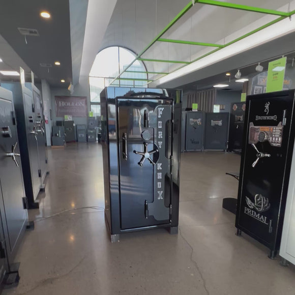 This Used Fort Knox Protector 6031 Measures 60"x31"x27", Weighs 1150 lbs and has a 90 min Fire Rating. This Fort Knox comes loaded with upgrades such as: Black Gloss Finish, Electronic Lock, Crane Hinge Door, Pull Handle, Corner Bolts, Lights, AC Plug and Extra Shelves. Can fit up to 18 Long Guns. This gorgeous safe is in excellent condition and sells new for $7850. Made in USA.