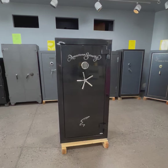This Used American Security Gun Safe Measures 59"x30"x21", Weighs 550 lbs and has a 30 min Fire Rating. It comes equipped with an Electronic Lock and a Door Organizer. Can fit up to 22 Long Guns inside and 2 on the door.