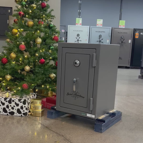 This Used Second Amendment Home Safe by Blue Dot Safes Measures 30"x20"x20", Weighs 238 lbs and has a 1 hour Fire Rating. It comes equipped with a Mechanical Dial Lock and 2 Shelves Inside. 12 Gauge Body and Door.
